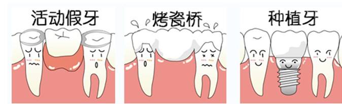 目前缺牙的主要修复手段有活动假牙、烤瓷牙和种植牙三种: